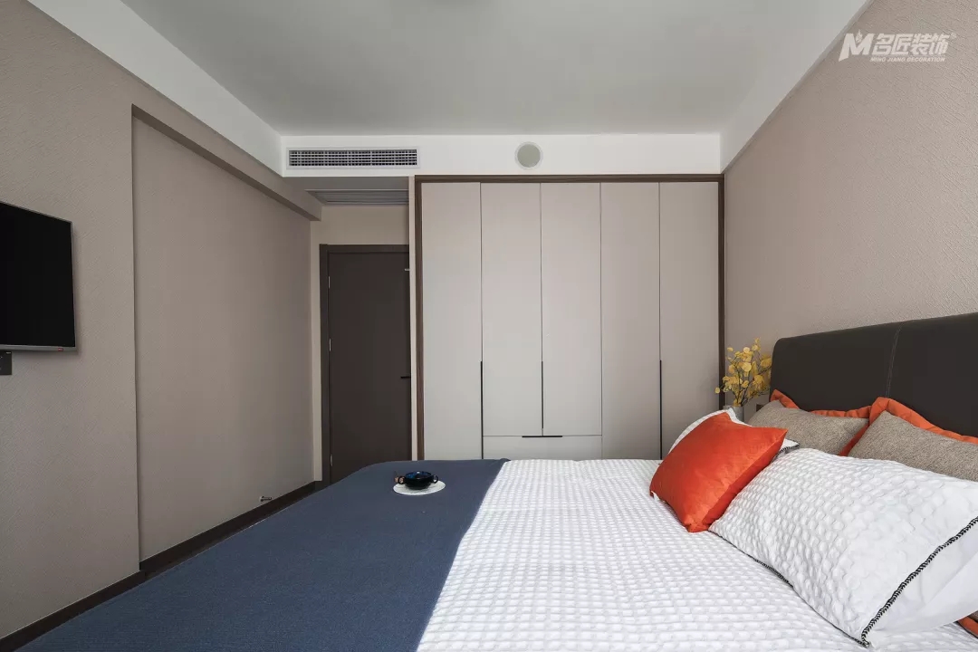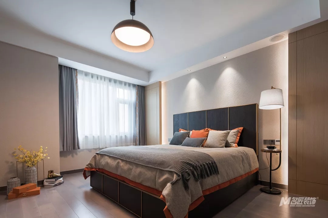 主卧的吊灯简约时尚,整个房间的设计简单但很有质感和品味。