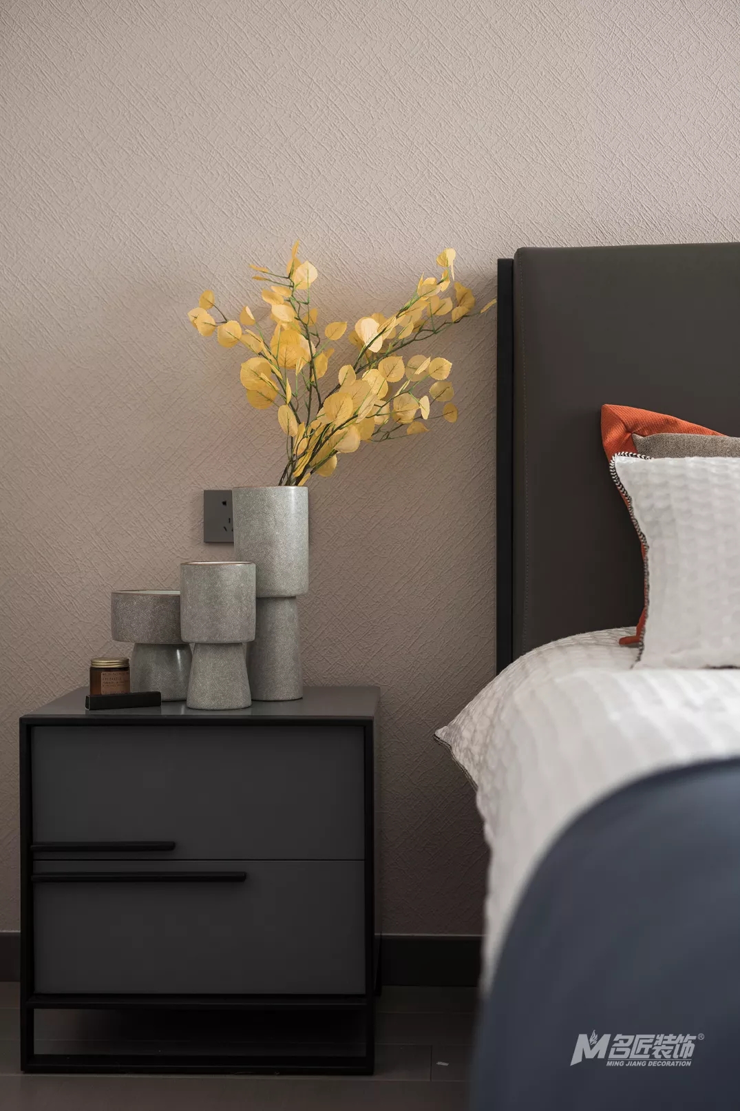 造型简约的床头柜,摆放着精致巧妙的摆件,为一片纯色的天地注入了新的秀色精致。