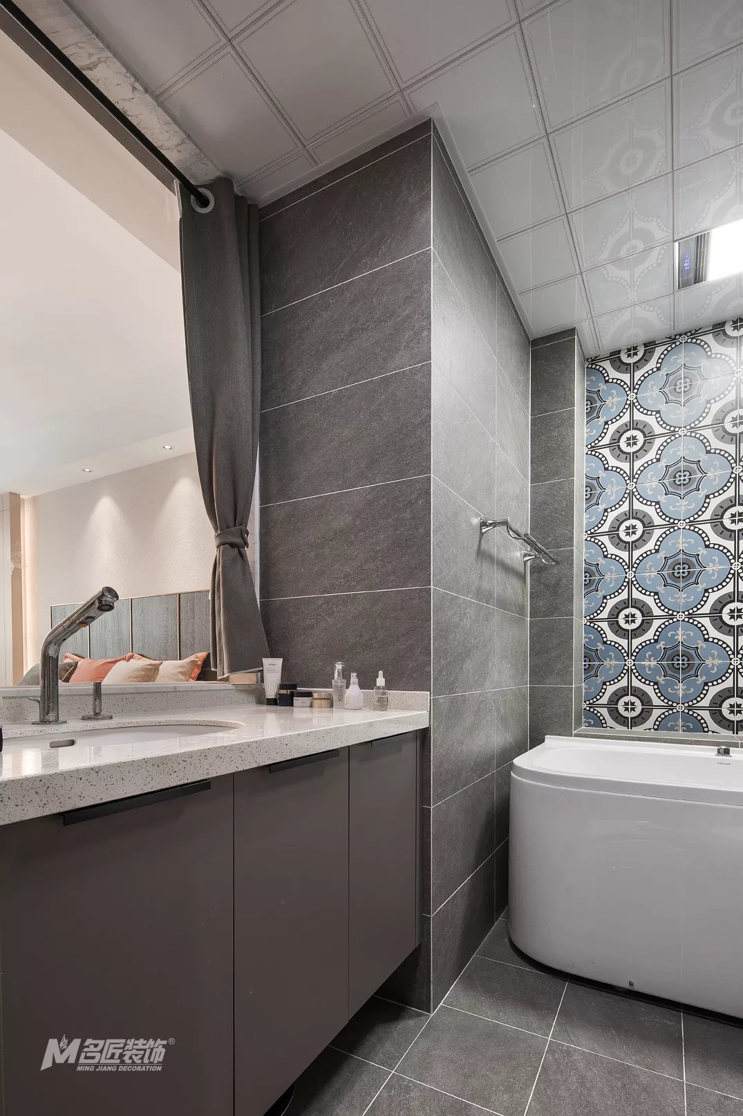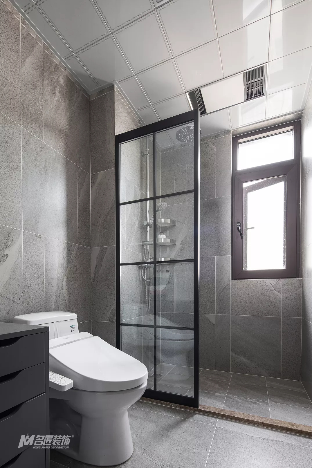 主卧套房内的卫生间,延续整体风格的高级灰色调,彰显时尚潮流的同时,也显得空间更加干净整洁。