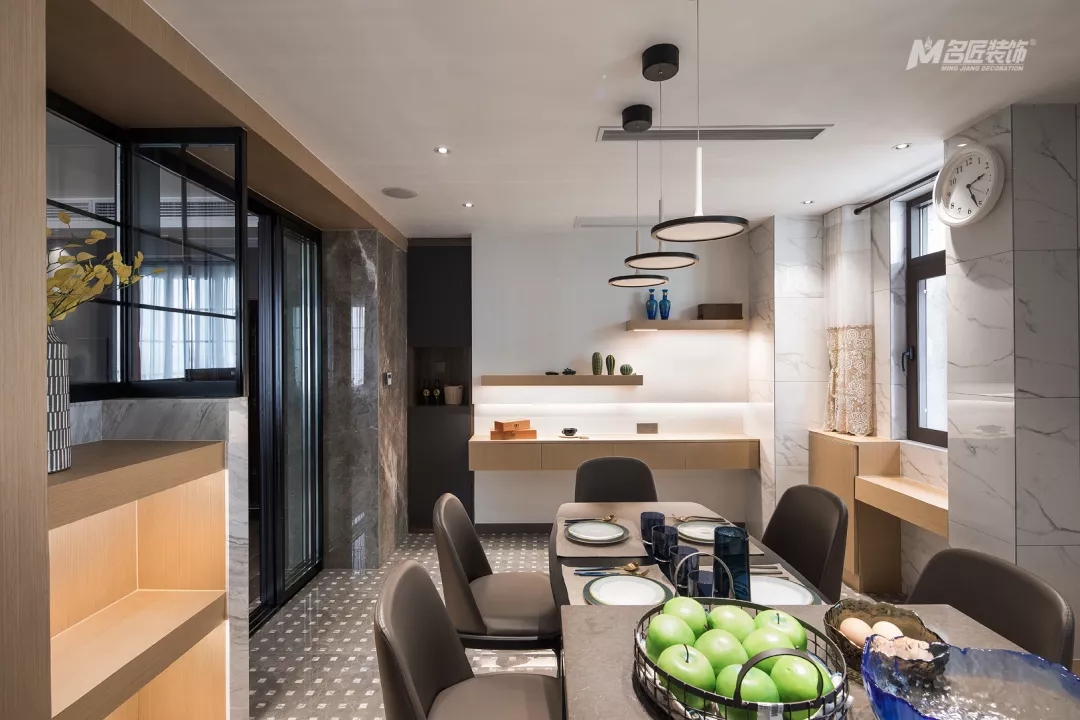 厨餐厅的另一端,墙面设计了木制隔板并装饰了一些小物品,为烹饪、就餐时光增添了不少情趣。