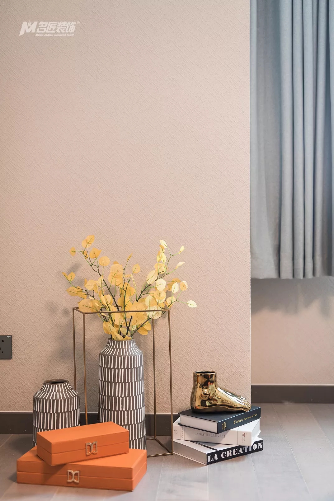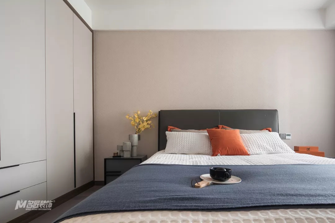 高级灰是一种不张扬的色彩,虽没有白色的纯净,也没有黑色的深邃,但是和其他色彩的相辅相成,会营造出极为精致的空间氛围,而在本案中,高级灰将会与爱马仕橙、原木色相互融合,带来极为时尚精致的家。